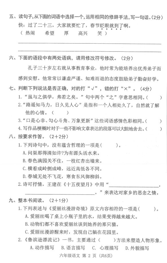 六、“安”改为“欣” 把“知难而退”删除。 每改对一处得1分,共2分