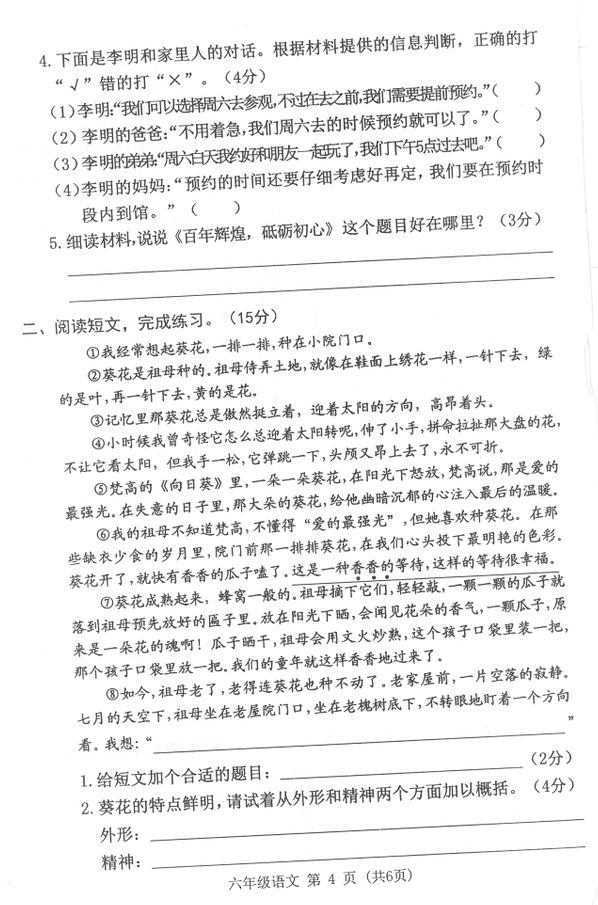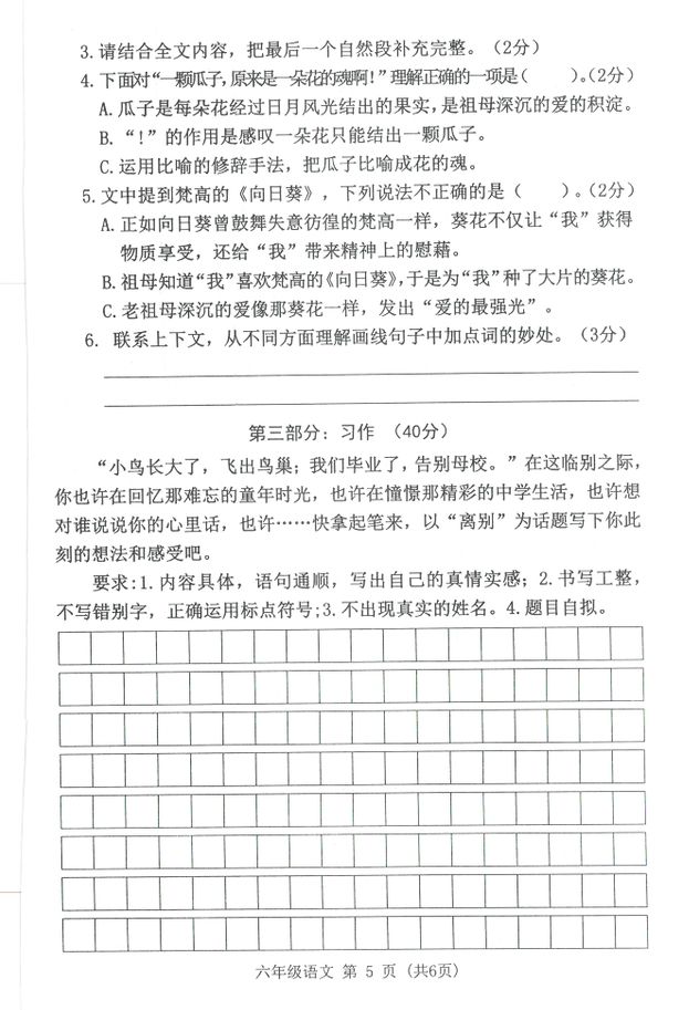 3.那里,一定有一棵葵花正在开放,开在祖母的心窝里。 供参考, 2分