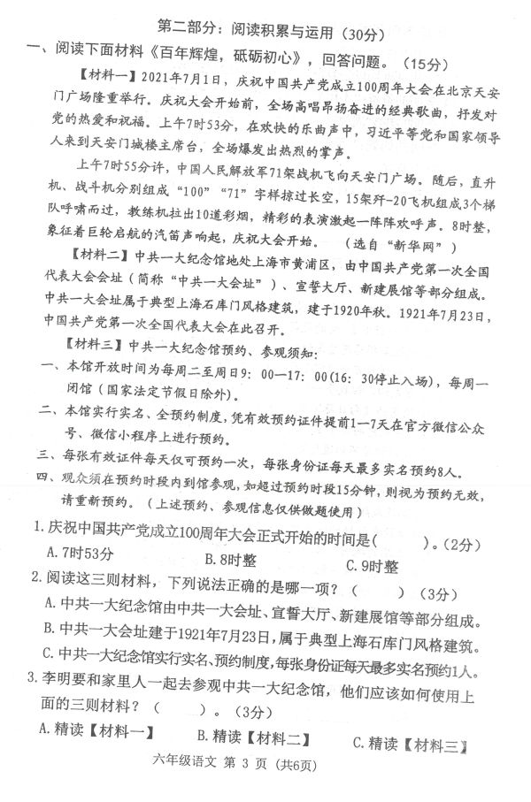 5.这个标题很好地概括了三则材料的主要内容。材料一介绍了中国共产党成立100周年大会,对应标题中的“百年辉煌”;材料二和材料三介绍了中共一大纪念馆,对应标题中的“砥砺初心” 供参考,3分