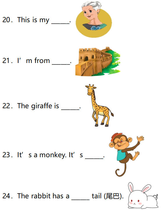 24.句意:兔子有_____尾巴。根据图片可知兔子有短尾巴,short短的,故选A。