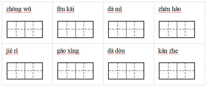 【解析】【分析】“中午”的“午”第一笔是撇;“分开”的“分”下面是“刀”;“大米”的“米”注意笔顺;“真好”的“真”里面是三横;“节日”的“节”是草字头,上下结构;“高兴”的“高”注意下面的“口”;“大豆”的“豆”是中间的“口”要写得扁一些;“看着”注意两个字形的区别。