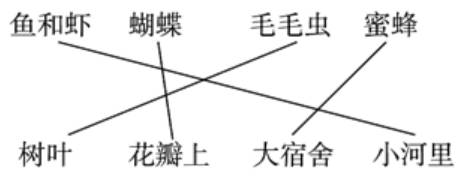16.本题主要考查对短文内容的理解能力。解答本题,需要仔细阅读短文的内容,然后结合题目提供的信息进行连线即可。“蓝色的小河里,住着鱼和虾。”鱼和虾住在小河里;“住在花瓣上的是蝴蝶。”蝴蝶住在花瓣上;“毛毛虫的摇篮是树叶。”毛毛虫住在树叶;“勤劳的蜜蜂,住在漂亮的大宿舍。”蜜蜂住在大宿舍。