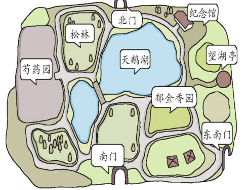 2.设计参观的路线,在示意图上画一画,并将所经之处填写下来。